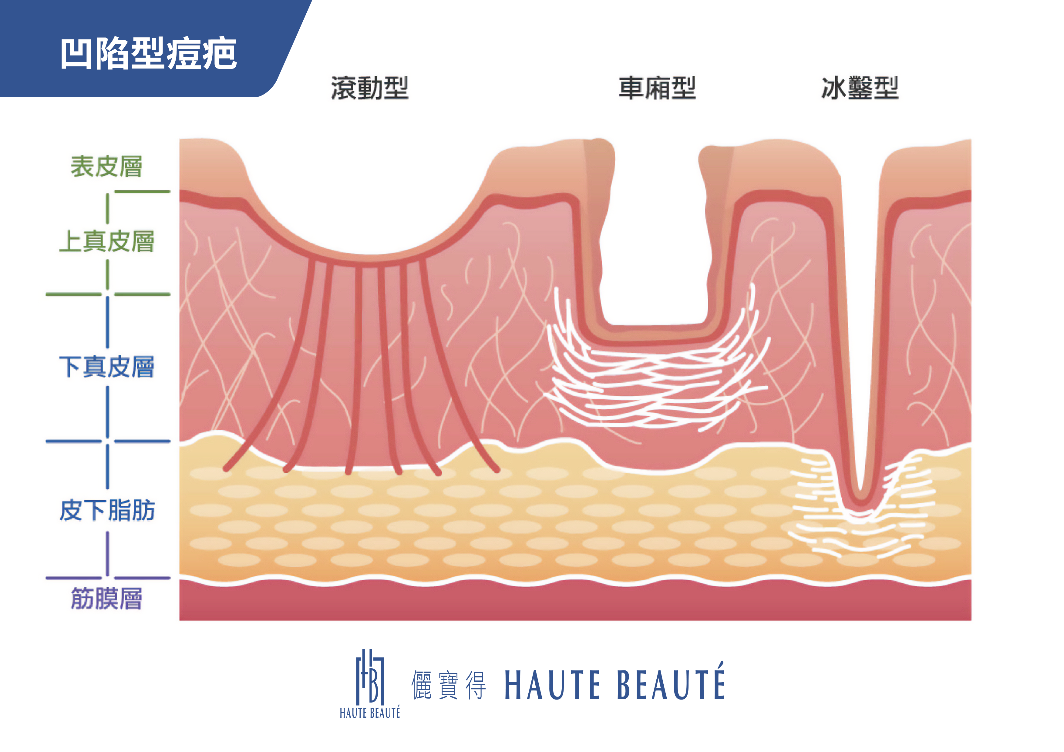 成因:這類痘疤多半是中度至重度痘痘反覆發炎後,真皮層的膠原蛋白遭到破壞,導致皮膚組織萎縮、塌陷所引起。依據外觀與凹陷的深淺形態,凹痘疤可再細分為3種類型:車廂型、滾動型與冰鑿型。在正式形成明顯凹陷前,這類痘疤通常會先出現紅腫、色素沉澱或輕微的淺層凹疤外觀。